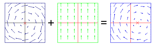 - Иллюстрация сложения полей Киллинга на плоскости. Поле вращений вокруг начала координат + поле параллельного переноса вдоль оси y = поле вращений вокруг центра, смещённого относительно начала координат вдоль оси x: