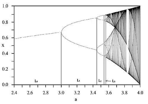 Одна из простейших динамических систем, где происходит каскад бифуркаций — это рекуррентные последовательности , где — некоторый параметр. Один из простейшиx примеров функции — логистическое отображение