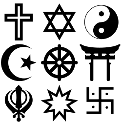 Предполагается, что тенденция людей видеть цель в симметрии, является одной из причин, почему симметрия часто является неотъемлемой частью символов мировых религий. Вот лишь некоторые из многих примеров, изображённые на рисунке справа.