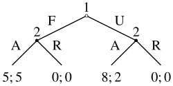На рисунке — игра для двух игроков. Игрок 1 ходит первым и выбирает стратегию F или U. Игрок 2 анализирует свою позицию и решает — выбрать стратегию A или R. Скорее всего, первый игрок выберет U, а второй — A (для каждого из них это оптимальные стратегии); тогда они получат соответственно 8 и 2 очка.