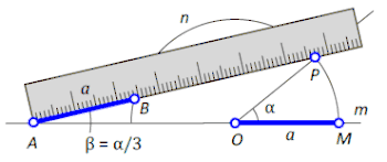 Построим окружность произвольного радиуса с центром в точке . Пусть стороны угла пересекаются с окружностью в точках и . Продолжим сторону исходного угла. Возьмём линейку невсиса, отложив на ней диастему , и используя прямую в качестве направляющей, точку в качестве полюса, а полуокружность в качестве целевой линии, строим отрезок . Получим угол , равный одной трети исходного угла .