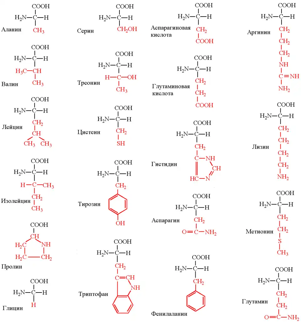 Жирным шрифтом выделены незаменимые аминокислоты.