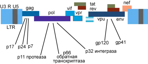 Генетический материал ВИЧ представлен двумя копиями положительно-смысловой (+)РНК[117]. Геном ВИЧ-1 имеет длину 9000 нуклеотидов. Концы генома представлены длинными концевыми повторами, которые управляют продукцией новых вирусов и могут активироваться и белками вируса, и белками инфицированной клетки.
