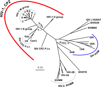 Вид ВИЧ-1 классифицируют на главную группу М и несколько побочных групп. Считается, что группы M, N, O, P образовались в результате независимых случаев передачи SIV от обезьяны к человеку, и последующей мутации вируса до ВИЧ[94].