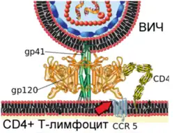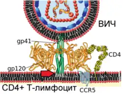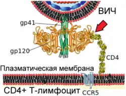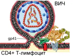 | gp41 (TM, transmembrane) | Трансмембранный гликопротеин массой 41 кДа | Располагается во внешнем слое липидной мембраны, играет роль «якоря», удерживающего молекулы белка gp120 |