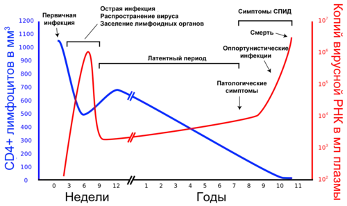 В течение болезни выделяют три стадии: острую инфекцию, латентный период и терминальную стадию (СПИД) (см. иллюстрацию). В ходе развития ВИЧ-инфекции у одного и того же человека в результате мутаций возникают новые штаммы вируса, которые различаются по скорости воспроизведения и способности инфицировать[8][9]. Размножившись, вирусные частицы высвобождаются из поражённых клеток и внедряются в новые — цикл развития повторяется. Инфицированные вирусом Т-хелперы постепенно гибнут из-за разрушения вирусом, апоптоза или уничтожения Т-киллерами. В процессе развития ВИЧ-инфекции количество CD3-CD4 лимфоцитов снижается настолько, что организм уже не может противостоять возбудителям оппортунистических инфекций, которые неопасны или мало опасны для здоровых людей с нормально функционирующей иммунной системой. Причины снижения могут быть различными: