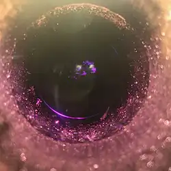 - Довольно известной качественной реакцией на иод является его взаимодействие с крахмалом[15], при котором наблюдается синее окрашивание в результате образования соединения включения. Эту реакцию открыли в 1814 году Жан-Жак Колен (фр. Jean-Jacques Colin) и Анри-Франсуа Готье де Клобри (фр. Henri-François Gaultier de Claubry)[16].