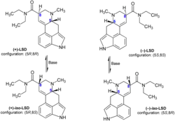 Однако, ЛСД и изо-ЛСД, два изомера С-8, быстро взаимопревращаются в присутствии оснований, поскольку альфа-протон является кислотным и может быть депротонирован и репротонирован. Непсихоактивный изо-ЛСД, который образовался во время синтеза, можно разделить с помощью хроматографии и изомеризовать в ЛСД.