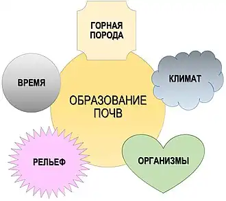 В. В. Докучаев с 1883 года[7] впервые рассматривает почву как самостоятельное природное тело, формирующееся под воздействием факторов почвообразования: «совокупностью причин (грунт, климат, рельеф, возраст и растительность)». Он уточняет факторы почвообразования и определение, что почва «есть функция (результат) от материнской породы (грунта), климата и организмов, помноженная на время»[8].