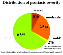 Псориаз обычно классифицируют по степени тяжести на лёгкий (с поражением менее 3 % поверхности кожи), средней тяжести (с поражением от 3 до 10 процентов поверхности кожи) и тяжёлый (с вовлечением более 10 процентов поверхности кожи). Псориатическое поражение суставов расценивается как тяжёлая форма псориаза, вне зависимости от площади поражения кожи. Существует несколько шкал для оценки степени тяжести псориаза. Оценка степени тяжести заболевания в целом базируется на оценке следующих факторов: площадь поражения (процент поверхности тела, вовлечённый в процесс), степень активности заболевания (степень красноты, отёчности, гиперемии псориатических бляшек или пустул, степень выраженности кожного зуда, степень утолщения кожи, степень шелушения, наличие кровоточивости или экссудации, вторичного инфицирования бляшек, степень припухлости и болезненности суставов), наличие общих симптомов активности процесса (таких, как повышенная утомляемость, повышенная СОЭ, повышенный уровень мочевой кислоты в анализах крови и т. п.), ответ больного на предшествующие попытки лечения, влияние заболевания на общее состояние и повседневную жизнь больного, на его социальное функционирование.