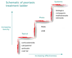 При лечении лёгких форм псориаза дерматологи стремятся использовать наименее токсичные средства и методы лечения, имеющие наименьший риск возможных побочных эффектов. Если поставленные цели лечения не достигнуты, могут быть испробованы другие методы лечения, потенциально более эффективные, но обладающие большей потенциальной токсичностью и имеющие более высокий риск серьёзных побочных эффектов. Лекарства и методы лечения, имеющие значительную токсичность и высокий риск серьёзных побочных эффектов, при этом обычно резервируются для случаев тяжёлого и при этом резистентного к другим, менее токсичным, методам лечения псориаза. Это называется «лестница терапевтических мероприятий»[49].