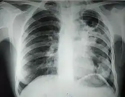 ![]() Рентгенограмма органов грудной клетки больного туберкулёзом лёгких с распадом | |