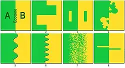 В природе, как правило, не существует чётких границ между различными экосистемами[21]. Всегда можно указать на ту или иную экосистему, но выделить дискретные границы, если они не представлены различными ландшафтными факторами (обрывы, реки, различные склоны холмов, выходы скальных пород и т. п.), не представляется возможным, ибо чаще всего существуют плавные переходы от одной экосистемы к другой[54]. Это обусловлено относительно плавным изменением градиента факторов среды (влажность, температура, увлажнённость и прочее). Иногда переходы из одной экосистемы в другую могут фактически являться самостоятельной экосистемой. Обычно сообщества, образующиеся на стыке различных экосистем, называются экотонами[55]. Термин «экотон» введён Ф. Клементсом в 1905 году.