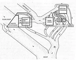 Экосистема является открытой системой и характеризуется входными и выходными потоками вещества и энергии. Основа существования практически любой экосистемы — поток энергии солнечного света[14], который является следствием термоядерной реакции, — в прямом (фотосинтез) или косвенном (разложение органического вещества) виде, за исключением глубоководных экосистем: «чёрных» и «белых»[15] курильщиков, источником энергии в которых является внутреннее тепло Земли и энергия химических реакций[15][16].