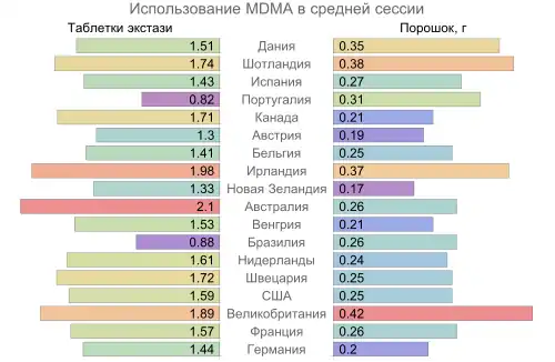 Учитываемые аналоги MDMA: MDA, MDEA, MBDB, ПАВ — психоактивные вещества. Источники:[35][36][37]:7, см. также этот раздел