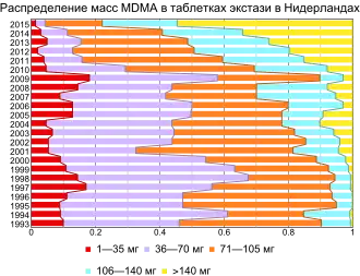 В начале распространения экстази отличалось от других нелегальных веществ высоким качеством: в Калифорнии анализ 1986 года показал, что основной примесью в уличных таблетках являлся MDA — также психоактивное вещество с близким действием, однако более токсичное[5]:291[21]. В 1990-е годы качество уличного экстази, измеряемое средним количеством MDMA в таблетке и наличием/отсутствием вредных для здоровья примесей, снижалось до середины десятилетия, когда многие таблетки экстази вообще перестали содержать MDMA[5]:291[21][35]. Затем в конце 90-х — начале 2000-х годов качество снова поднялось до уровня 1980-х[21], после чего несколько деградировало к концу 2000-х, что связывают с ограничением доступности прекурсора MDMA пиперонилметилкетона (MDP2P)[3]:115[5]:291. В дальнейшем появилась тенденция к новому повышению содержания MDMA в таблетках экстази в связи с переходом на новые прекурсоры[3]:115[38]. Исследования образцов волос людей, принимающих экстази, практически всегда показывают присутствие MDMA (2008 и 2011)[5]:291, равно как и анализы продающихся в Европе и США таблеток[39]:46—47. С 2010-х годов получил распространение также порошок MDMA — молли или манди, пользующийся славой более чистого варианта препарата, чем таблетки экстази[40].