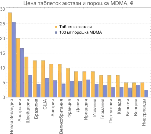В Европе в незаконном производстве экстази традиционно высокой остаётся роль Нидерландов и Бельгии[37]:6, в меньшей степени Польши, однако к 2013 году усилилась роль Германии, Болгарии, западнобалканских стран и стран Балтии[3]:114. Согласно отчётам EMCDDA, в большинстве стран Европы, по которым есть данные, с 2007 по 2012 год наблюдалось либо стабильное, либо падающее употребление экстази[102] , сменившееся новым ростом в 2013—2015[37]:10. Анализы сточных вод, проведённые в девятнадцати европейских городах в 2012 году, показали употребление MDMA в диапазоне 32—615 мг (около 1/4—5 типичных доз) на 1000 человек в день[103]. Опрос молодёжи 15—24 лет в ЕС в 2011 году относительно простоты покупки экстази в течение 24 часов дал 8 % ответов «легко», 14 % «довольно легко», 25 % «довольно сложно», 28 % «очень сложно» и 20 % «невозможно»[104]:9. Аналогичные данные по старшеклассникам США в 2010-х годах дают цифры в 35—40 % уверенных в простоте покупки экстази[105].