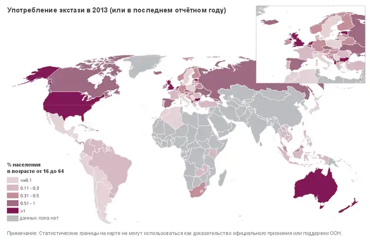 По данным исследования 2009 года, в Европе 3,3 % всех взрослых (11 миллионов человек) хоть раз пробовали в жизни экстази, а 2,5 миллиона — принимали его хотя бы раз в течение последнего года, похожие числа показало исследование 2012 года в США: 16,2 миллиона пробовавших хотя бы раз в жизни, и 2,6 миллиона принимавших его хотя бы раз за последний год[96]:245—246. Более высокие числа показало исследование European Monitoring Centre for Drugs and Drug Addiction (EMCDDA), опубликованное в 2010 году — 8,6 % взрослых европейцев (16—65 лет) хотя бы раз пробовали в жизни экстази[5]:290.