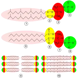 Молекулы, из которых построены мембраны архей, сильно отличаются от тех, которые используются в мембранах других организмов. Это указывает на то, что археи состоят лишь в отдалённом родстве с бактериями и эукариотами[62]. У всех живых организмов клеточные мембраны построены из фосфолипидов. Молекулы фосфолипидов состоят из двух частей: гидрофильной полярной, состоящей из фосфатов, и гидрофобной неполярной, состоящей из липидов. Эти компоненты объединены через остаток глицерина. В воде молекулы фосфолипидов кластеризуются, при этом фосфатные «головки» оказываются обращёнными к воде, а липидные «хвосты» — обращёнными от неё и спрятанными внутрь кластера. Главная составляющая мембраны — два слоя таких фосфолипидов, называемые липидным бислоем.