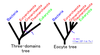 Эволюционное родство между археями и эукариотами остаётся неясным. Помимо сходства в структуре и функциях клеток, между ними существует сходство на генетическом уровне. Установлено, что группа архей кренархеоты стоят ближе к эукариотам, чем к другому типу архей — эвриархеотам[43]. Кроме того, у некоторых бактерий, как Thermotoga maritima обнаружены архееподобные гены, переданные путём горизонтального переноса[44]. Наиболее распространена гипотеза, согласно которой предок эукариот рано отделился от архей[45][46], а эукариоты возникли в результате слияния археи и эубактерии, ставших цитоплазмой и ядром новой клетки. Эта гипотеза объясняет различные генетические сходства, но сталкивается с трудностями в объяснении клеточной структуры[47].