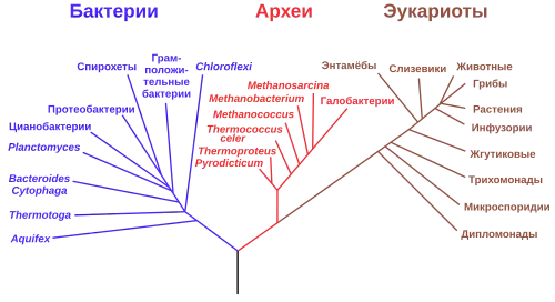 Установление степени родства между тремя доменами имеет ключевое значение для понимания возникновения жизни. Большинство метаболических путей, в которых задействована большая часть генов организма, схожи у бактерий и архей, в то время как гены, отвечающие за экспрессию других генов, очень похожи у архей и эукариот[33]. По строению клеток археи наиболее близки к грамположительным бактериям: клетка покрыта единственной плазматической мембраной, дополнительная внешняя мембрана, характерная для грамотрицательных бактерий, отсутствует[34], клеточные стенки различного химического состава, как правило, толстые[35]. В филогенетическом древе, основанном на сравнительном анализе структур гомологичных генов/белков прокариот, гомологи архей наиболее близки к таковым грамположительных бактерий[34]. В некоторых важнейших белках архей и грамположительных бактерий, таких как Hsp70 и глутаминовая синтетаза I, обнаруживаются одинаковые эволюционно консервативные вставки и делеции[34][36][37].