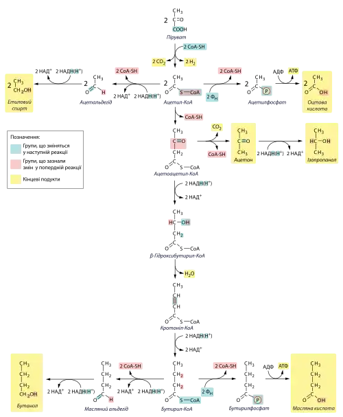 Путь брожения может быть прямым или разветвлённым, при котором окислительный этап удлиняется, что сопровождается увеличением энергетического выхода. Молекулы промежуточного продукта в восстановительном этапе могут также подвергаться дополнительным преобразованиям для повышения их акцепторной способности[17].