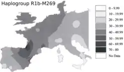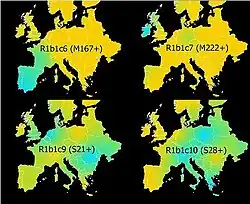 Как заметили Барбара Арреди и её коллеги, распределение R1b в Европе образует клин с Востока на Запад, что соответствует теории проникновения её носителей в Европу из Западной Азии с распространением земледелия[76]. Дальнейшие исследования 2009 года Chiaroni et al., указывает на то, что гаплогруппа R1b имеет наиболее старые субклады в Западной Азии и наиболее поздние в Западной Европе.