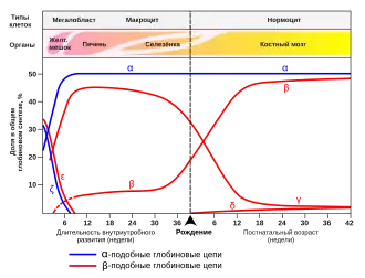 У младенцев человека молекула гемоглобина состоит из 2 α-цепей и 2 γ-цепей. По мере роста ребёнка γ-цепи постепенно заменяются β-цепями.