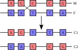 Рекомбинация происходит в результате физического разрыва в хромосомах (М) и (F) и их последующего соединения с образованием двух новых хромосом (C1 и C2)