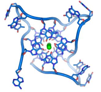 В клетках человека теломеры часто представлены одноцепочечной ДНК и состоят из нескольких тысяч повторяющихся единиц последовательности ТТАГГГ[58]. Эти последовательности с высоким содержанием гуанина стабилизируют концы хромосом, формируя очень необычные структуры, называемые G-квадруплексами и состоящие из четырёх, а не двух взаимодействующих оснований. Четыре гуаниновых основания, все атомы которых находятся в одной плоскости, образуют пластинку, стабилизированную водородными связями между основаниями и хелатированием в центре неё иона металла (чаще всего калия). Эти пластинки располагаются стопкой друг над другом[59].