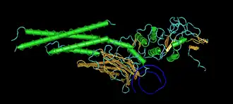 Взаимодействие фактора транскрипции STAT3 с ДНК (показана в виде синей спирали)