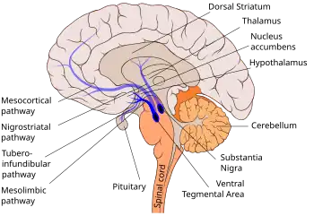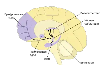 Как часть системы регулирования чувства удовольствия дофамин производится в телах нейронов, расположенных в ВОП, и высвобождается в прилежащее ядро и префронтальную кору. Его моторные функции связаны с другим путём: производящие гормон клеточные тела расположены в чёрной субстанции, а высвобождение гормона происходит в полосатое тело