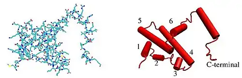 IFNγ мономер состоит из ядра из шести α-спиралей и расширенной развёрнутой последовательности в С-концевой области.[10][11] Это показано в структурных моделях ниже. α-спирали в ядре структуры пронумерованы от 1 до 6.