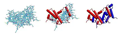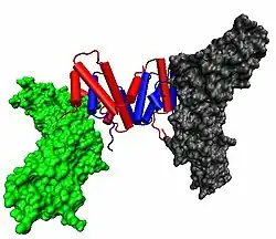 Биологически активный димер образуется путём антипараллельного взаимоблокирования двух мономеров, как показано ниже. В нарисованной модели один мономер показан красным цветом, другой – синим.