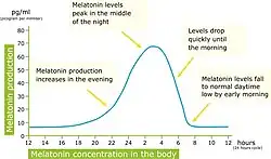 Концентрация мелатонина в сыворотке крови человека начинает возрастать примерно за 2 часа до привычного для данного субъекта времени отхода ко сну (если нет яркого света)[8][* 2]. Максимальные значения концентрации наблюдаются всегда во время темновой фазы естественного цикла чередования дня и ночи (обычно между полуночью и 5 часами утра по местному солнечному времени[3]) или искусственно созданного суточного цикла чередования освещённости[7]:13. Пик концентрации часто обнаруживается в 2—3 часа ночи[8][3][7]:14[6][5]:260[* 3].
