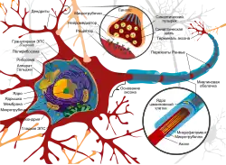Тело нейрона имеет диаметр от 3 до 130 мкм. Тело содержит ядро (с большим количеством ядерных пор) и органеллы (в том числе сильно развитый шероховатый ЭПР с активными рибосомами, аппарат Гольджи), а также отростки. Выделяют два вида отростков: дендриты и аксон. Нейрон имеет развитый цитоскелет, который проникает в его отростки. Цитоскелет поддерживает форму клетки, его нити служат «рельсами» для транспорта органелл и упакованных в мембранные пузырьки веществ (например, нейромедиаторов). Цитоскелет нейрона состоит из фибрилл разного диаметра: микротрубочки (Д = 20—30 нм) состоят из белка тубулина и тянутся от нейрона по аксону вплоть до нервных окончаний. Нейрофиламенты (Д = 10 нм) вместе с микротрубочками обеспечивают внутриклеточный транспорт веществ. Микрофиламенты (Д = 5 нм) состоят из белков актина и, в отличие от других клеток, не содержат миозина, что делает невозможным сокращение в этих клетках, сами микрофиламенты особенно выражены в растущих нервных отростках и в нейроглии. Нейроглия, или просто глия (от др.-греч. νεῦρον — волокно, нерв + γλία — клей) — совокупность вспомогательных клеток нервной ткани. Составляет около 40 % объёма ЦНС. Количество глиальных клеток в мозге примерно равно количеству нейронов.
