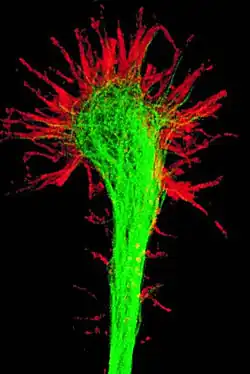 Вопрос о делении нейронов в настоящее время остаётся дискуссионным. По одной из версий, нейрон развивается из небольшой клетки-предшественницы, которая перестаёт делиться ещё до того, как выпустит свои отростки. Первым начинает расти аксон, а дендриты образуются позже. На конце развивающегося отростка нервной клетки появляется утолщение, которое прокладывает путь через окружающую ткань. Это утолщение называется конусом роста нервной клетки. Он состоит из уплощённой части отростка нервной клетки со множеством тонких шипиков. Микрошипики имеют толщину от 0,1 до 0,2 мкм и могут достигать 50 мкм в длину, широкая и плоская область конуса роста имеет ширину и длину около 5 мкм, хотя форма её может изменяться. Промежутки между микрошипиками конуса роста покрыты складчатой мембраной. Микрошипики находятся в постоянном движении — некоторые втягиваются в конус роста, другие удлиняются, отклоняются в разные стороны, прикасаются к субстрату и могут прилипать к нему.