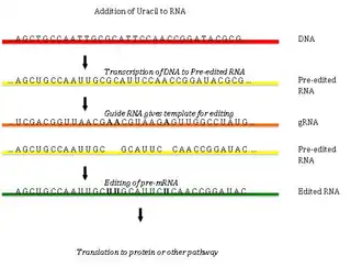 Редактирование РНК путём встраивания или удаления урацилов было описано в митохондриях кинетопластид Trypanosoma brucei[3][4][5][6][7][8][9][10]. Редактирование РНК начинается со спаривания первичного нередактированного транскрипта с направляющей (гидовой) РНК, которая содержит комплементарные последовательности около сайтов встраивания или удаления. Образующийся двуцепочечный участок далее покрывается эдитосомой — крупным многобелковым комплексом, катализирующим редактирование РНК[4][5]. Эдитосома начинает встраивание уридинов по первому положению неспаренных нуклеотидов. Встраиваемые уридины образуют комплементарные связи с направляющей РНК, и встраивание продолжается, пока в направляющей РНК встречаются A или G, и останавливается при появлении C или U[6][7]. Встраиваемые нуклеотиды вызывают сдвиг рамки считывания и приводят к тому, что транслируемый белок отличается от кодирующей области гена.