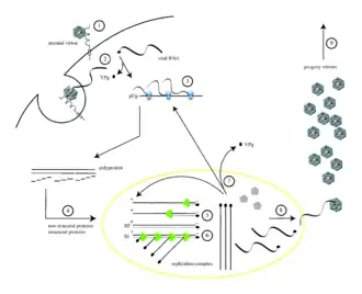 Многие вирусы, например, вирус гриппа, на всех стадиях содержат геном, состоящий исключительно из РНК. РНК содержится внутри обычно белковой оболочки и реплицируется с помощью закодированных в ней РНК-зависимых РНК-полимераз. Вирусные геномы, состоящие из РНК разделяются на