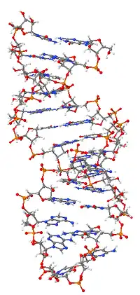 Двухцепочечная РНК (дцРНК, dsDNA- double-stranded DNA) — это РНК с двумя комплементарными цепями, подобная ДНК, обнаруженной во всех клетках, но с заменой тимина урацилом и добавлением одного атома кислорода. Двухцепочечная РНК образует генетический материал некоторых вирусов (вирусов с двухцепочечной РНК). Двухцепочечная РНК, такая как вирусная РНК или миРНК, может запускать РНК-интерференцию у эукариот, а также интерфероновый ответ у позвоночных[56][57][58][59].