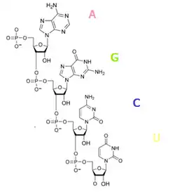 Нуклеотиды РНК состоят из сахара — рибозы, к которой в положении 1' присоединено одно из оснований: аденин, гуанин, цитозин или урацил. Фосфатная группа соединяет молекулы рибозы в цепочку, образуя связи с 3'-атомом углерода одной молекулы рибозы и с атомом углерода в 5'-положении другой. Фосфатные группы при физиологическом рН заряжены отрицательно, поэтому РНК — полианион. РНК транскрибируется как полимер четырёх оснований (аденина (A), гуанина (G), урацила (U) и цитозина (C), но в «зрелой» РНК есть много модифицированных оснований и сахаров[14]. Всего в РНК насчитывается около 100 разных видов модифицированных нуклеотидов, из которых 2'-О-метилрибоза наиболее частая модификация сахара, а псевдоуридин — наиболее часто встречающееся модифицированное основание[15].