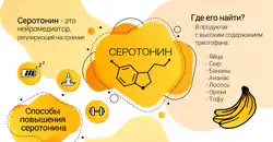 Пищевые продукты с повышенным содержанием триптофана (аминокислота, из которой образуется серотонин): молочные продукты (особенно сыр), финики, сливы, инжир, томаты[85], соя, чёрный шоколад, способствуют биосинтезу серотонина и часто улучшают настроение. Они же могут быть причиной острых токсических реакций (серотониновый синдром), если употребляются в больших количествах на фоне лечения некоторыми группами антидепрессантов — ингибиторами моноаминоксидазы (ИМАО) или селективными ингибиторами обратного захвата серотонина (СИОЗС).