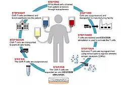 Технология CAR позволяет перепрограммировать собственные иммунные клетки пациента за пределами его тела, с тем чтобы создать CAR, позволяющий охотиться на раковые клетки и эффективно разрушать опухоли у пациента.[3][4] Полученные клетки CAR затем используют для так называемой адоптивной иммунотерапии — разновидности иммунотерапии рака[5][6][7][8][9]. Обычно CAR состоят из внеклеточного антигенраспознающего фрагмента, который связан, с помощью спейсера-шарнира и трансмембранного домена, со внутриклеточным доменом сигнализации, который может состоять из костимулирующего домена[10][11] и участка Т-клеточной активации.