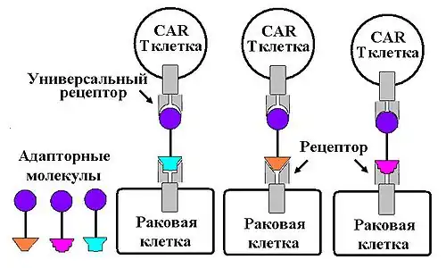 В дополнение к антиген-специфическому связыванию, разработаны так называемые «универсальные системы CAR». Так например, разработаны CAR, связывающие авидин[18], что позволило использовать единожды полученный CAR не против одного антигена, ассоциированного с опухолью, а против бесчисленного множества различных антигенов, распознаваемых с помощью различных антител, модифицированных биотином[18], что позволяет выявлять их авидином (реакция авидин-биотин). Аналогичным образом устроена универсальная система CAR, связывающая флуоресцеинизотиоцианат (FITC)[19][20] Универсальная система CAR названная «Supra CAR» состоит из двух модулей: универсального рецептора (zipCAR) и адаптерного модуля scFv распознающего антиген опухоли (zipFv). Универсальный рецептор zipCAR образуется в результате слияния внутриклеточных сигнальных доменов и лейциновой «застёжки-молнии» (zipper) в качестве внеклеточного домена. Молекула адаптера zipFv состоит из домена узнающего и соединяющегося с лейциновой «застёжкой-молнией» и домена scFv. ScFv молекулы zipFv связывается с опухолевым антигеном, а лейциновая молния связывает и активирует zipCAR на иммунных клетках. Модуль универсального рецептора zipCAR может быть расположен на различных типах клеток: на T-лимфоцитах с CD4+ и CD8+ корецепторами Т-клеточных рецепторов; на регуляторных Т-клетках, а также на NK-клетках. Множество различных zipFv молекул позволяет легко и быстро перенастраивать систему на новые антигены без необходимости заново конструировать CAR-Т-клетки.[21]