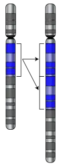 Изменения на хромосомном уровне могут приводить к ещё большим мутациям. Среди хромосомных мутаций выделяют делеции и инверсии крупных участков хромосом, транслокацию участков одной хромосомы на другую. Также возможно слияние хромосом (робертсоновская транслокация). Например, в ходе эволюции рода Homo произошло слияние двух хромосом с образованием второй хромосомы человека[72]. У других обезьян этого слияния не произошло, и хромосомы сохраняются по отдельности. В эволюции хромосомные перестройки играют большую роль. Благодаря им может ускориться расхождение популяций с образованием новых видов, поскольку уменьшается вероятность скрещивания и таким образом увеличиваются генетические различия между популяциями[73].