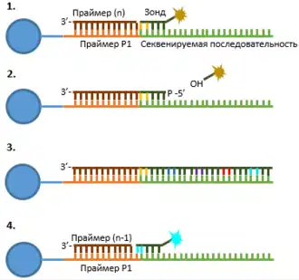 Процесс секвенирования состоит из пяти раундов, каждый раунд состоит из 6-7 циклов. Каждый раунд начинается с добавления универсального праймера длины n, комплементарного P1. В каждом цикле 8-ми нуклеотидные зонды добавляются и лигируются к праймеру, их первые два нуклеотида комплементарны двум нуклеотидам секвенируемой последовательности. Затем отмывают от остающихся несвязанных зондов, измеряют флуоресценцию лигированного зонда и разрезают его между пятым и шестым основаниями. По окончании последнего цикла проводят диссоциацию синтезированной цепи ДНК от матрицы, прикрепленной к бусине. Это необходимо для того, чтобы в следующем раунде уже использовать новые праймер и зонды. Праймер теперь берут длины n-1. Итак, в ходе пяти раундов используются праймеры, комплементарные P1, длины n, n-1, n-2, n-3, n-4 относительно 3'-конца P1. Таким образом можно секвенировать примерно 25 нуклеотидов последовательности.