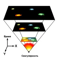 Экстраполяция наблюдаемого расширения Вселенной назад во времени приводит, при использовании общей теории относительности и некоторых других альтернативных теорий гравитации, к бесконечной плотности и температуре в конечный момент времени в прошлом. Кривизна пространства-времени достигает неопределённо большого значения. Это состояние называется космологической сингулярностью (часто космологическую сингулярность образно называют «рождением» Вселенной). Невозможность избежать сингулярности в космологических моделях общей теории относительности была доказана, в числе прочих теорем о сингулярностях, Р. Пенроузом и С. Хокингом в конце 1960-х годов.
