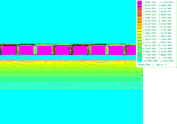 Поперечное сечение линейного двигателя, расположенного над толстой алюминиевой плитой. По мере того как диаграмма поля линейного асинхронного двигателя смещается влево, в металле остаются вихревые токи, что вызывает наклон силовых линий.
