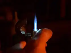 Пламя при горении углеводородных топлив в горелке Бунзена, таких как пропан или бутан, может иметь разный цвет в зависимости от соотношения горючего и воздуха. При горении в диффузионном режиме без подачи воздуха в горелку пламя окрашено в жёлтый или красноватый цвет, обусловленный свечением раскалённых микрочастиц сажи. При подмешивании небольшого количества воздуха на выходе из горелки возникает неяркий синий конус пламени. Дальнейшее увеличение подачи воздуха приводит к возникновению двух конусов пламени, внутреннего яркого сине-зелёного и внешнего сине-фиолетового, гораздо менее интенсивного[31].