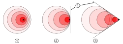 Фронт ударной волны по мере удаления от аппарата постепенно принимает почти правильную коническую форму, перепад давления на нём уменьшается с увеличением расстояния от вершины конуса, и ударная волна превращается в звуковую. Угол между осью и образующей конуса связан с числом Маха соотношением